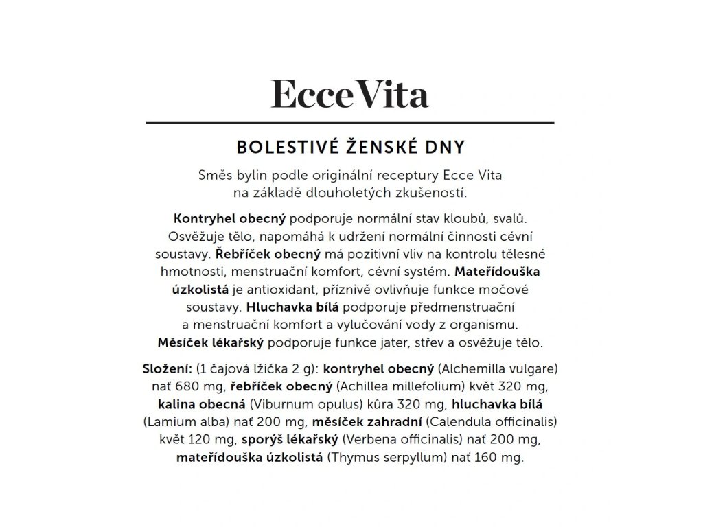 Směs 7 bylin podle originální recepturyEcce Vita® s kontryhelem, řebříčkem, hluchavkou a dalšími bylinkami pro podporu před menstruačního a menstruačního komfortu.