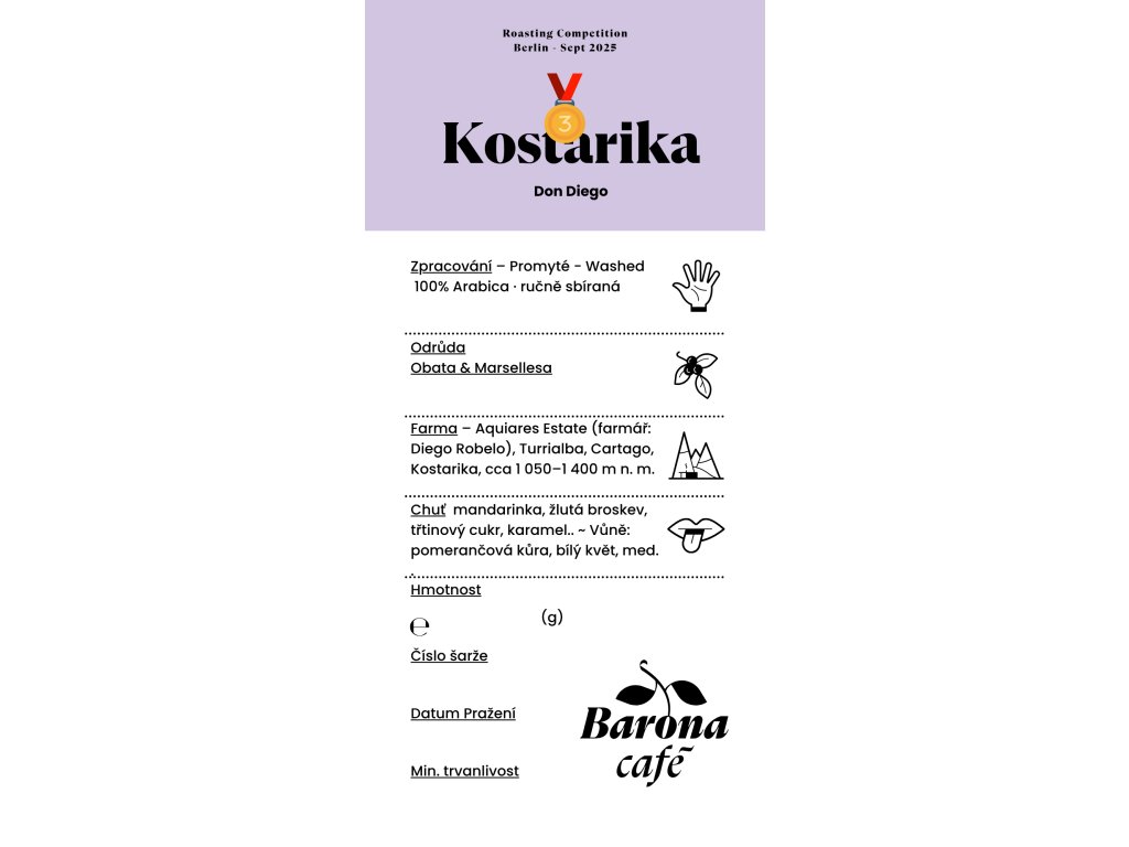 Velké díky našim přátelům a zákazníkům, kteří nás inspirovali podat to nejlepší v pražicí soutěži v Berlíně (25. září 2025), kde jsme získali 3. místo mezi 21 evropskými pražiči. Pěstitel Diego Robelo, promyté (24 h fermentace, mechanické mytí), Profil: čistota, sladkost, jasná citrusová acidita, květinové tóny. Limitovaná šarže.